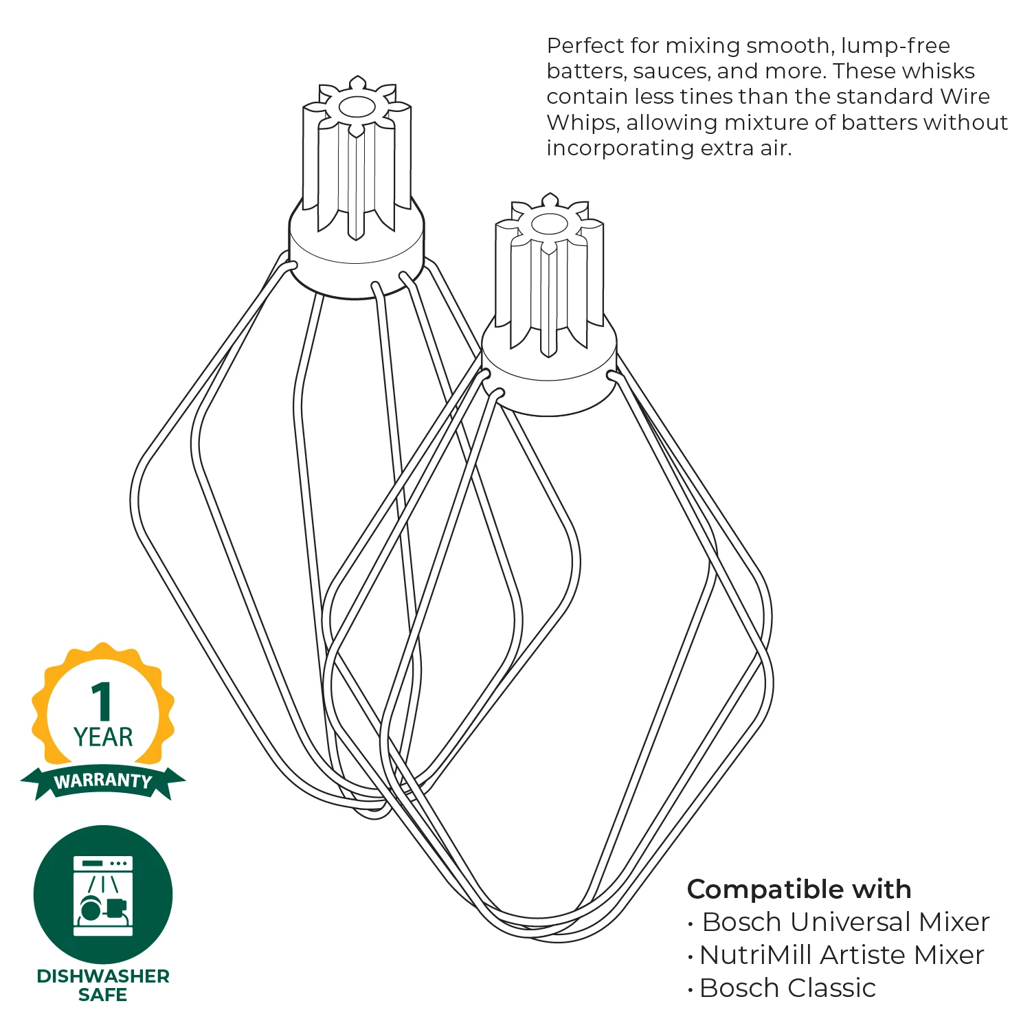 Batter Whisks are perfect for mixing smooth, lump-free batters, sauces, and more. These whisks contain fewer tines than the standard Wire Whips, allowing a mixture of batters without incorporating extra air. Must be used with a Metal Whip Driver or Plastic Whip Driver, not included.