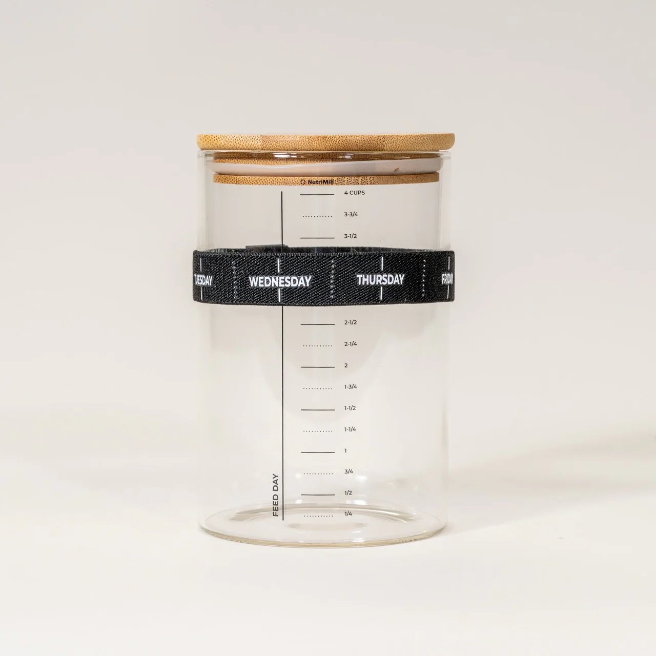 Upgrade your sourdough baking routine with the NutriMill 1-Quart Sourdough Starter Jar, the perfect tool for maintaining a large, healthy starter. Made from high-quality glass, this jar features easy-to-read measurements and a day marker band, allowing bakers to track feedings and monitor starter growth with ease. The bamboo lid provides a natural, breathable seal, ensuring optimal fermentation conditions.